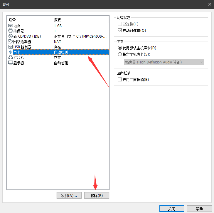 移除 USB 控制器、声卡、打印机。关闭回到上一界面,点完成
