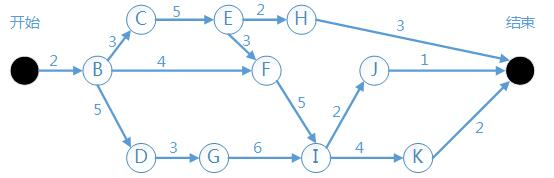 下图是一个软件项目的活动图,其中项点表示项目的里程碑,连接顶点的边表示包含的活动,则完成该项目的最少时间为( 1 )天,活动 BD 最多可以晚开始( 2 )天而不会影响整个项目的进度。