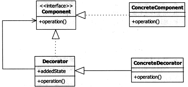 下图是 ( 1 ) 设计模式的类图,该设计模式的目的是 ( 2 ), 图中,Decorator 和 Component 之间是 ( 3 ) 关系,ConcreteDecorator 和 Decorator 之间是 ( 4 ) 关系。